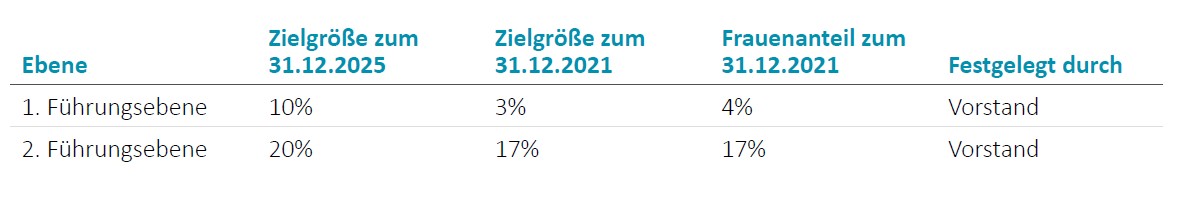 Nach erfolgreicher Besetzung offener Posten im Vorstand, bei der der Aufsichtsrat das Diversitätskonzept berücksichtigt und im Rahmen dessen auch weibliche Kandidatinnen in Betracht gezogen wurden, ist der Generationenwechsel im Vorstand abgeschlossen. Ausgehend von der nun vorliegenden Struktur sind keine Änderungen in der Zusammensetzung geplant, so dass die bis zum 31. Dezember 2025 geltende Zielvorgabe für den Anteil von Frauen im Vorstand konsequenterweise auf 0% festgelegt wurde. Der Frauenanteil im Vorstand findet Beachtung im Rahmen der langfristigen Nachfolgeregelung.