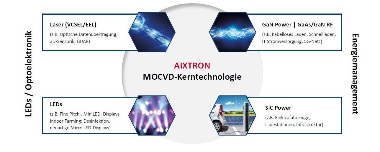 Die Nachfrage nach den AIXTRON-Anlagen wird maßgeblich durch Anforderungen an höhere Energieeffizienz in der IT, durch den Ausbau der Elektromobilität, durch steigende Übertragungsgeschwindigkeit und –menge von Daten sowie durch den Einsatz von 3D-Sensorik in Unterhaltungselektronik und im Automobilsektor und nicht zuletzt dem Einsatz innovativer Technologien in Displays beeinflusst. Mit seinen Technologien zur Materialbeschichtung versetzt AIXTRON seine Kunden in die Lage, die Leistungsfähigkeit und die Qualität modernster Bauelemente der Leistungs- und Optoelektronik zu verbessern und die Wirtschaftlichkeit bei der Produktion zu steigern.