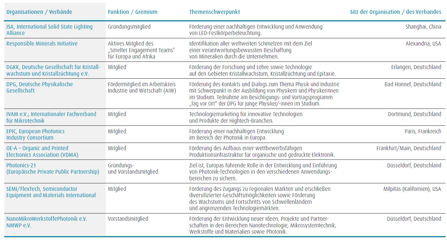 Wir sind in einer Vielzahl von Organisationen und Verbänden mit dem Ziel engagiert, die nachhaltige Entwicklung und Ressourceneffizienz in der Photonik und der Halbleitertechnik weiter voranzubringen. Bei Photonics21, heute ein Private Public Partnership (PPP) mit der Europäischen Kommission und der International Solid State Lighting Alliance (ISA) in China sind wir Gründungsmitglied und fördern deren weitere Entwicklung aktiv.