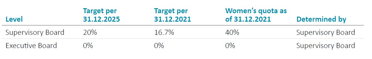 Following the successful appointment of vacant positions on the Executive Board, in which the Supervisory Board took the diversity concept into account and as part of which female candidates were also considered, the generational transition on the Executive Board has been completed. Based on the structure now in place, no changes in composition are planned, so the target for the proportion of women on the Executive Board valid until December 31, 2025, has been set consistently at 0%. The proportion of women on the Board of Management is taken into account as part of the long-term succession planning.