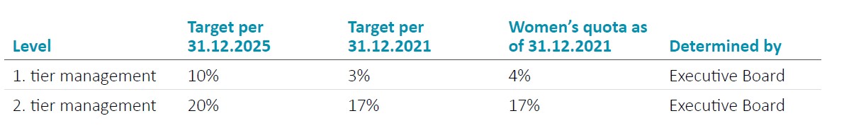 Pursuant to Sections 76 para. 4, 111 para. 5 of the German Stock Corporation Act (AktG), the Supervisory boards and Executive Boards of companies that are listed on the stock exchange or subject to co-determination must set target figures for the proportion of women on the Supervisory Boards, Executive Boards and the two management levels below the Executive Board. The DCGK reflects these regulations in principle 3 and principle 9 sentence 2 DCGK 2020 for the Executive Board and in recommendation C.1 sentence 2 DCGK 2020 for the Supervisory Board.