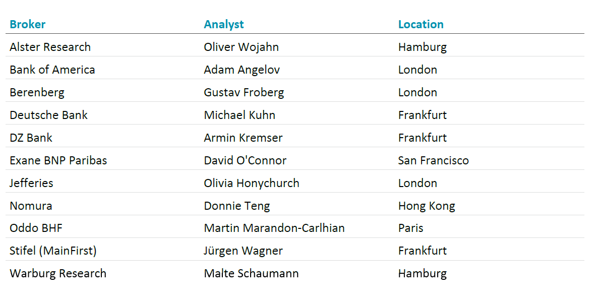 During the fiscal year of 2022, a total of eleven international banks and brokerage houses (2021: twelve) published stock research reports on AIXTRON and the development of the semiconductor industry on a frequent basis. Barclays stopped analyzing AIXTRON shares last year. Nomura, Jefferies and Bank of America initiated coverage in 2022. Of the eleven financial analysts who observed our shares at the end of 2022, eight issued a buy recommendation and three recommended holding the AIXTRON share. The average target price at the end of December 2022 was EUR 25.00 (2021: EUR 23.55). At the end of the year, the AIXTRON share was covered by the following sell-side analysts (the current status can be found on our website):