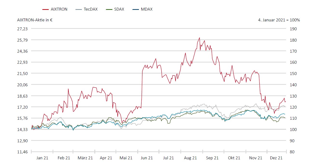 Die AIXTRON-Aktie beendete das Börsenjahr 2021 am 30. Dezember mit einem Plus von 25% bei einem Kurs von 17,87 Euro, was einer Marktkapitalisierung von 2.024,5 Mio. Euro entsprach. Die Vergleichsindizes MDAX und TecDAX konnten im Laufe des Jahres 2021 um 14,1% von 30.796 Punkten auf 35.123 Punkte beziehungsweise um 22,0% von 3.213 Punkten auf 3.920 Punkte zulegen.