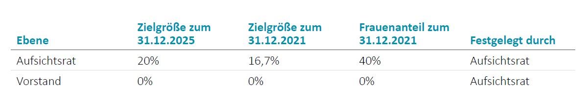 Nach erfolgreicher Besetzung offener Posten im Vorstand, bei der der Aufsichtsrat das Diversitätskonzept berücksichtigt und im Rahmen dessen auch weibliche Kandidatinnen in Betracht gezogen wurden, ist der Generationenwechsel im Vorstand abgeschlossen. Ausgehend von der nun vorliegenden Struktur sind keine Änderungen in der Zusammensetzung geplant, so dass die bis zum 31. Dezember 2025 geltende Zielvorgabe für den Anteil von Frauen im Vorstand konsequenterweise auf 0% festgelegt wurde. Der Frauenanteil im Vorstand findet Beachtung im Rahmen der langfristigen Nachfolgeregelung.