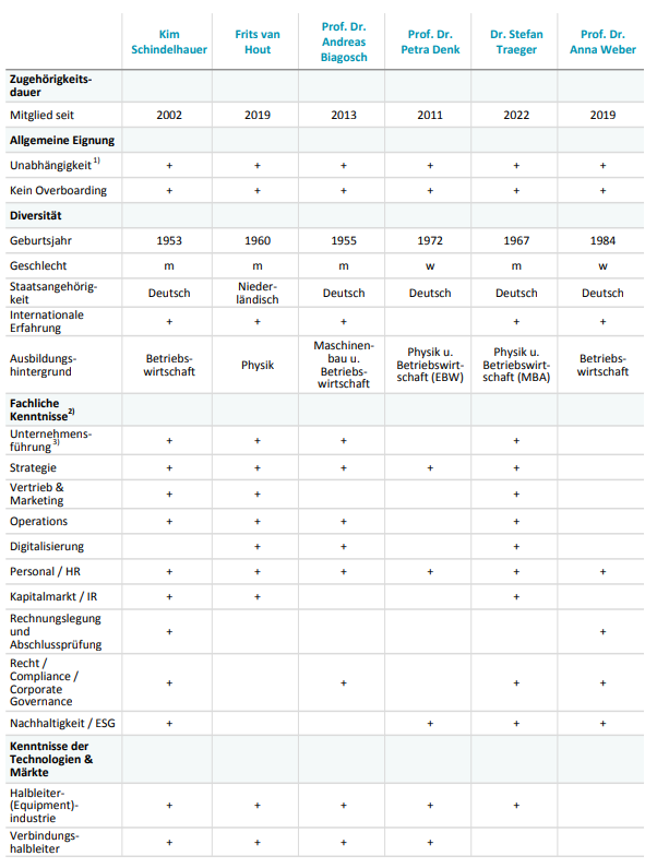 Der Forderung nach Vielfalt innerhalb des Aufsichtsrats (Empfehlung C.1 Satz 2 DCGK 2022) wird u.a. aufgrund der vielseitigen Kompetenzen der einzelnen Aufsichtsratsmitglieder (im Hinblick auf Bereiche wie Finanzen, Kapitalmarkt, M&A sowie Technologie und Märkte) Rechnung getragen.