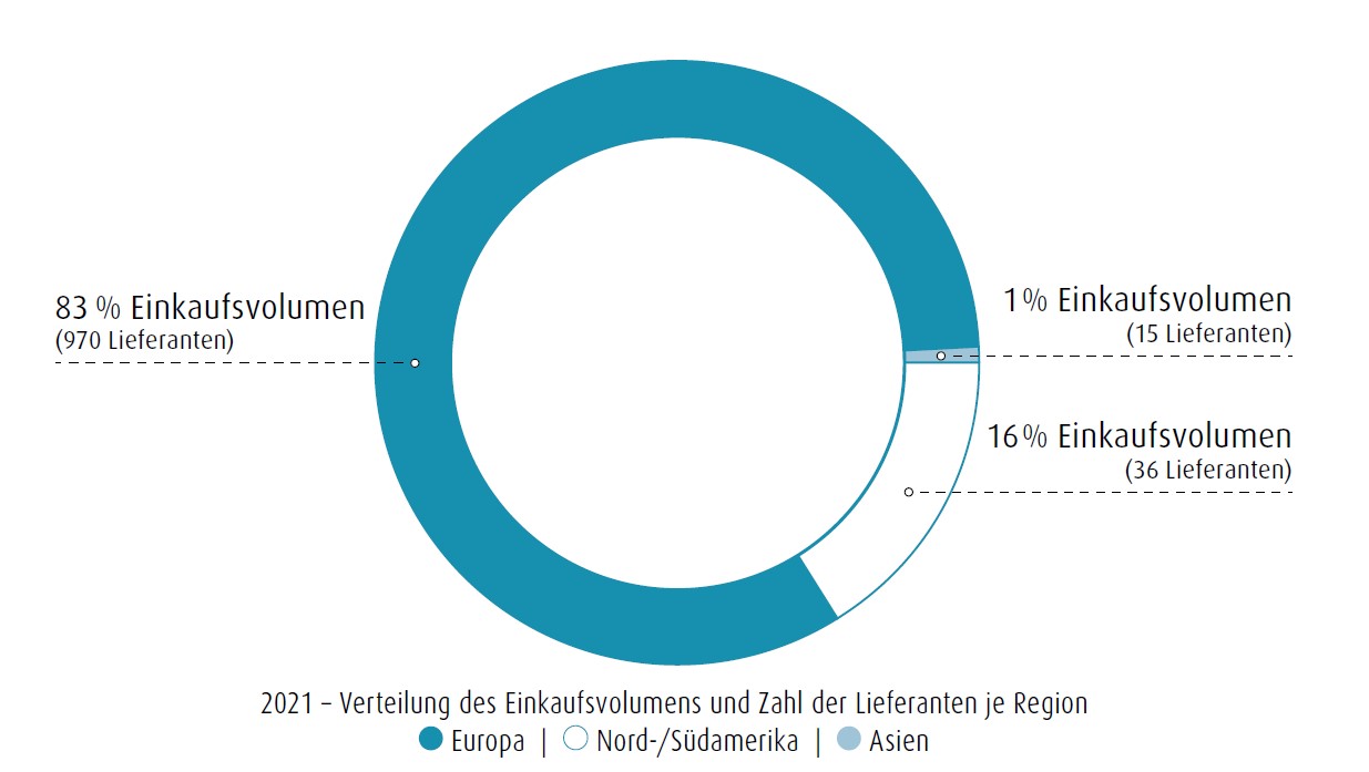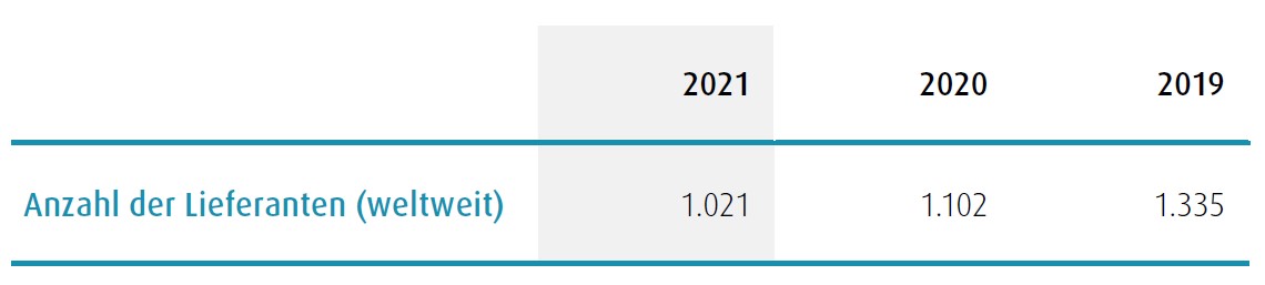 Aktuell arbeiten wir mit 1.021 Lieferanten aus 27 Ländern (2020: 1.102 Lieferanten aus 30 Ländern) zusammen. Die Einhaltung von Nachhaltigkeitsaspekten wird dabei über einen risikoorientierten Ansatz überwacht. Im ersten Schritt wird die Einhaltung von Umwelt- und Sozialstandards aller Lieferanten durch Selbstauskunft in Form eines Fragebogens geprüft. Lieferanten müssen darin