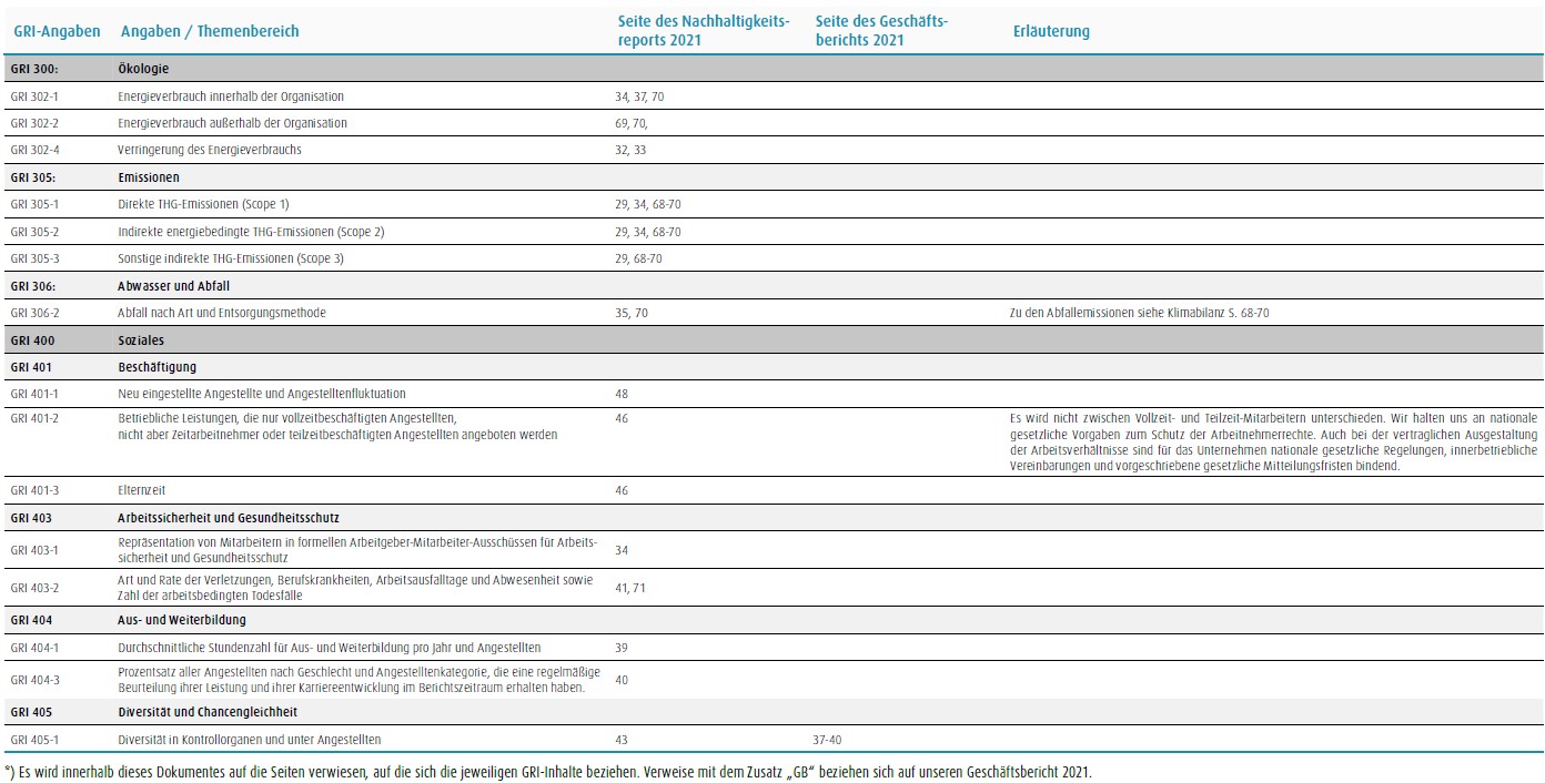 Im Folgenden haben wir die wichtigsten nichtfinanziellen Kennzahlen in tabellarischer Form zusammengestellt, sowie den Inhaltsindex der Global Reporting Initiative GRI aufgeführt aus dem hervor geht an welchem Stellen in diesem Bericht Informationen zu finden sind, die den Anforderungen der GRI entsprechen. Zusätzlich haben wir den Vermerk des Wirtschaftsprüfers aufgeführt, der diesen Bericht einer unabhängigen Prüfung mit begrenzter Sicherheit unterzogen hat.