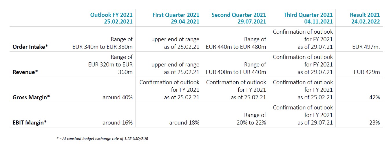 In order to give our stakeholders including our shareholders the opportunity to follow our business development, we regularly publish our guidance for the current year with the publication of the annual report of the previous year. The order intake, revenue, gross margin and EBIT margin forecasts for the 2021 financial year published in the 2020 Annual Report and raised several times in the course of the year were fully met.