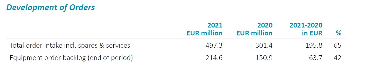 At EUR 214.6 million, the equipment order backlog as of December 31, 2021, was also higher than the order backlog of EUR 150.9 million at the end of 2020 (2021 budget rate: 1.25 USD/EUR; 2020 budget rate: 1.20 USD/EUR). Compared to the end of the previous quarter, the order backlog decreased due to the high number of shipments in the fourth quarter by 20% at year-end (September 30, 2021: EUR 267.6 million).
