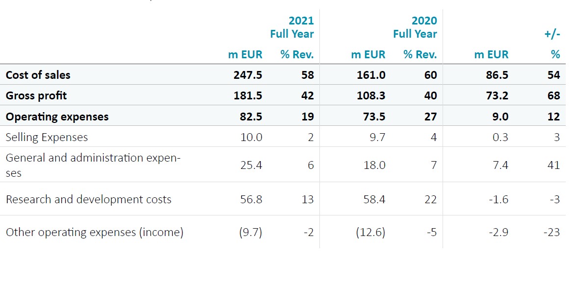 Cost of sales amounted to EUR 247.5 million in the past fiscal year (2020: EUR 161.0 million) and decreased relative to revenues to 58% (2020: 60%). This is mainly due to a more favorable product-mix. This resulted in a gross profit of EUR 181.5 million in the fiscal year, which corresponds to a gross margin of 42%.