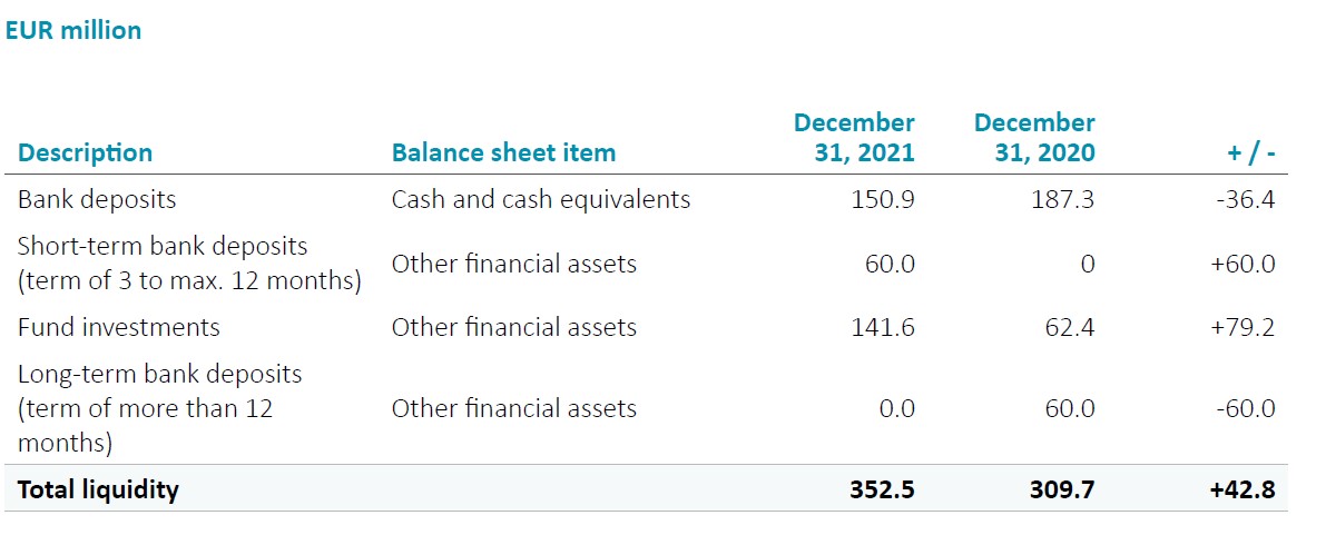 Cash and cash equivalents including other financial assets increased to EUR 352.5 million as of December 31, 2021 (December 31, 2020: EUR 309.7 million). As of December 31, 2021, other financial assets included fund investments in the amount of EUR 141.6 million and, in addition, bank deposits, primarily in euros, with a maturity of less than twelve months in the amount of EUR 60.0 million, which were reported under other non-current assets in the previous year due to their maturity and were reclassified to current financial assets in the financial year (see also “Investments”).