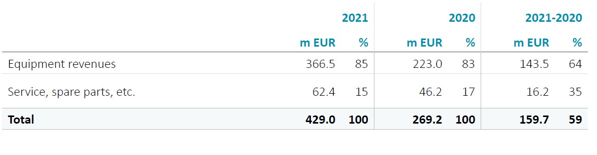 Equipment revenues in 2021 amounted to EUR 366.5 million, of which EUR 139.7 million (38%) was generated by MOCVD/CVD equipment for the production of components for the power electronics segment (GaN/SiC) and EUR 137.0 million (37%) by MOCVD equipment for the optoelectronics segment (laser, solar and telecom). Further fundamental growth is expected in the aforementioned markets, as modern power electronics components are increasingly made of silicon carbide or gallium nitride materials, and the use of lasers in the fields of optical data transmission and 3D sensor technology continues to increase.