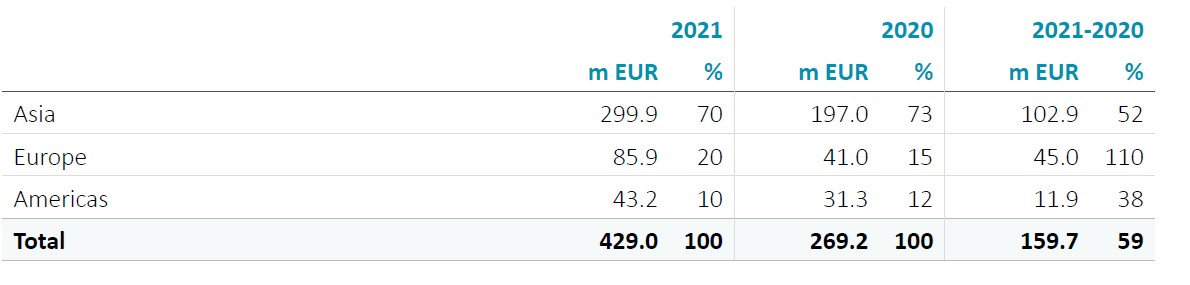 At EUR 299.9 million, demand from customers in Asia continued to account for the majority of total revenues in 2021. The lower contribution from customers outside of Asia were a result of the regional mix of customers addressing the above-mentioned demand drivers.