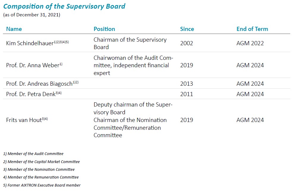Further details on the work of the Executive Board, Supervisory Board and committees during fiscal year 2021 can be found in the Report of the Supervisory Board, which is part of the Annual Report and can be downloaded from the AIXTRON website. Full details of the composition of the committees can be found in the section “Supervisory Board and its composition”.