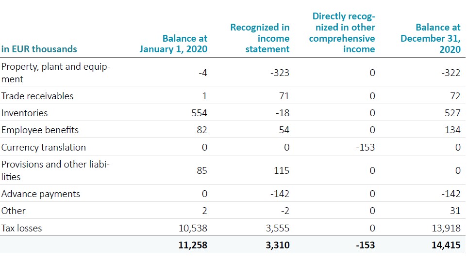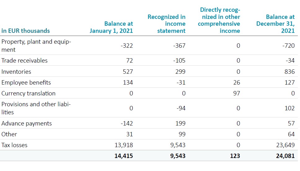 a) Total deferred tax assets of kEUR 24,735 (accounting for 3.3% of the Group’s total assets) are stated as “Deferred tax assets” in the consolidated statement of financial position. These deferred tax assets were determined based on the Group’s tax planning and mainly result from tax loss carry-forwards (kEUR 23,649) and deductible differences between IFRS carrying values and their tax base to be reversed in the following years (kEUR 1,086). The majority of the deferred tax assets (kEUR 20,714) results from the parent company AIXTRON SE, which has comprehensive tax loss carry-forwards. The executive directors are of the opinion that for the parent company a reasonable derivation of an estimation of taxable results beyond a period of twelve months after the reporting date is not possible for a technology company characterized by highly fluctuating demand and volatile results. Accordingly, deferred taxes on tax loss carry-forwards and temporary differences concerning the parent company AIXTRON SE were only recognized insofar as they are expected to be used in 2022. The deferred tax assets concerning the parent company AIXTRON SE are measured using a tax rate of 32.8%, which is the currently applicable income tax rate. The other deferred tax assets result from tax loss carry-forwards and deductible differences concerning the foreign subsidiaries of AIXTRON SE. As they are largely secured by costplus agreements with the parent company, which bears the major risks, these deferred tax assets are based on tax planning strategies over a period of three years using the corresponding local tax rates.